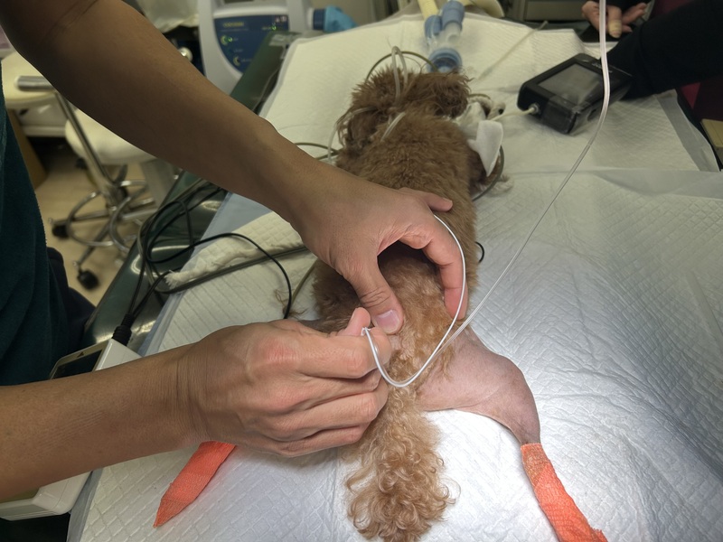 手術中は、獣医師または専任スタッフがつきっきりでバイタルサイン(血圧、心拍数、呼吸状態、体温、麻酔濃度など)を監視します。数値のわずかな揺らぎも見逃さず、その場で薬の量を微調整し続けることで、安定した状態を維持します。